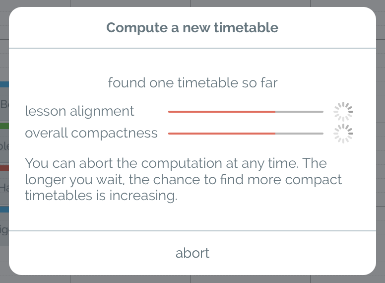 To compute a timetable enter your desired teaching time and the free time frames of your students. You can see a red dot next to the student's name if you and the student have not enough overlapping spare time.