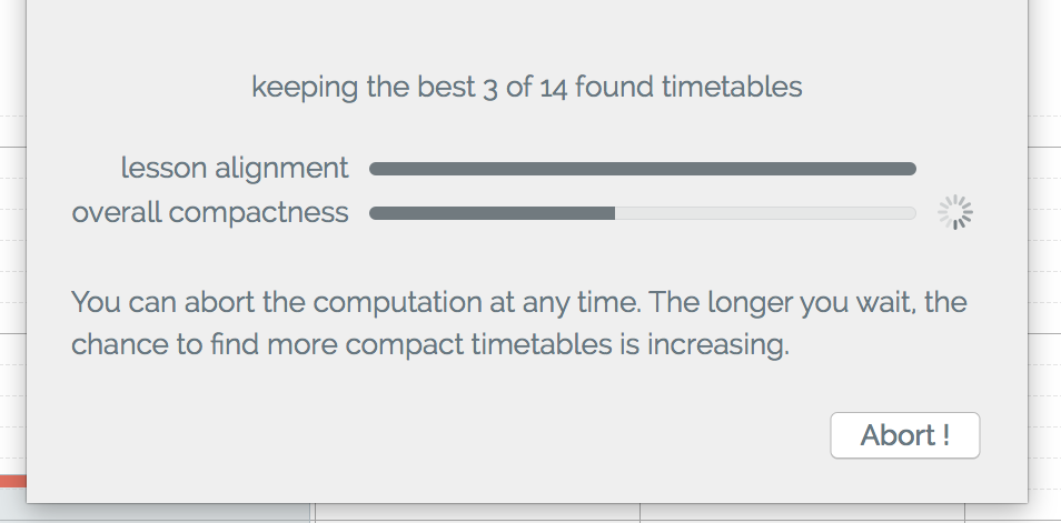 To compute a timetable enter your desired teaching time and the free time frames of your students. You can see a red dot next to the student's name if you and the student have not enough overlapping spare time.